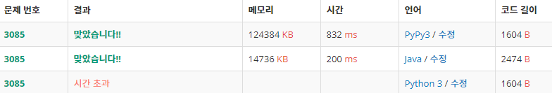 μμ κ°μ λ‘μ§μ λ€λ₯Έ μΈμ΄λ₯Ό μ¬μ©νλ€λ©΄ μκ° λ΄μ ν΅κ³Όν μ μμ§λ§, νμ΄μ¬μ ν΅κ³Όν μ μμΌλ©° PyPy3λ₯Ό μ¬μ©νμ¬μΌ νλ€.