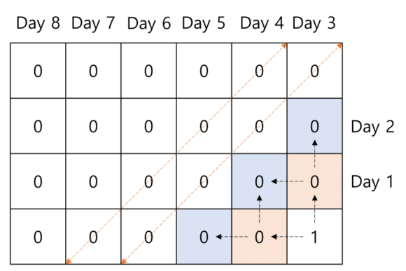 ์์ ๊ทธ๋ฆผ์ ์์ ์ ๋ ฅ 1์ด๋ค. ์์ ์ ๋ ฅ 1์ ๊ฒฝ์ฐ ํ ๋งํ ๊ฐ ์ต๋๋ฐ ๊ฑธ๋ฆฌ๋ ์๊ฐ์ 8์ผ์ด ์์๋๋ค. ์ด๋ ์ฐ์ธก ํ๋จ์ ์๋ ์ต์ ํ ๋งํ ๋ฅผ ๊ธฐ์ค์ผ๋ก ๊ทธ๋ฆผ๊ณผ ๊ฐ์ด ํ๋ฃจ๊ฐ ์ง๋จ์ ๋ฐ๋ผ ๋๊ฐ์ ๋ฐฉํฅ์ผ๋ก ํ ๋งํ ๋ค์ด ์ต๊ธฐ ๋๋ฌธ์ด๋ค. ๋ฐ๋ผ์ ๋จ์ํ ์, ํ, ์ข, ์ฐ๋ฅผ ํ์ํ๋ ๊ฒ์ด ์๋ ๋์ผํ ๋ ์ ์ํฅ์ ๋ฐ์ ๊ฒ์ธ์ง ํ๋จํ๋ ๊ณผ์ ์ด ํ์ํ๋ค.