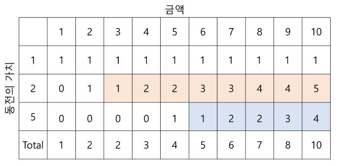 μμ κ°μ΄ λμ μ κ°μΉμ λ°λΌ λ°μν μ μλ κ²½μ°μ μλ₯Ό ꡬν μ μλ€. κ°μ₯ μμ λμ μΌλ‘ ꡬν μ μλ κ²½μ°μ μλ κΈμ‘μ λ°λΌ 1κ°μ§μ©λ§ μ‘΄μ¬νκ² λλ€. νμ§λ§ κ·Έ λ€μμΌλ‘ ν° κ°μΉμ λμ μ λν κ²½μ°μ μλ₯Ό κ³μ°νκΈ° μν΄μλ μ΄μ μ ꡬν κ²½μ°μ μλ₯Ό ν©μ°ν΄μ£Όμ΄μΌ λλ€.
