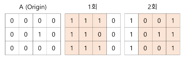 ํ๋ ฌ์ด ์ฃผ์ด ์ง ๋, 3 * 3 ํฌ๊ธฐ์ ํด๋นํ๋ ๋ถ๋ถ์ ๋ฐ์ ์ํฌ ์ ์๋ค. ์ด๋ ํ๋ ฌ A, B๊ฐ ๊ฐ์์ง ์ ์๋๋ก ํ๋ ์ต์ ์ฐ์ฐ ๊ฐ์ ๊ตฌํ๊ณ ๊ตฌํ ์ ์๋ค๋ฉด -1์ ๋ฐํํ๋ค. ์์ ์ ๋ ฅ 1์ ๊ฒฝ์ฐ ์๋์ ๊ทธ๋ฆผ๊ณผ ๊ฐ์ด 2๋ฒ์ ์๋๋ก B์ ๊ฐ๊ฒ ๋ง๋ค ์ ์๋ค.