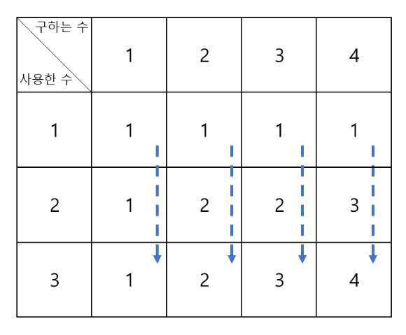 ๋ฌธ์ ๋ฅผ ํ๊ธฐ ์ํด DP ๋ฐฐ์ด์ ๊ตฌ์ฑํ๋ค๋ฉด ์์ ๊ฐ์ ๊ท์น์ ๊ฐ์ง์ ์ ์ ์๋ค. ์๋ฅผ ๋ค์ด N์ด 4๋ผ๋ฉด 1, 2, 3์ผ๋ก ๊ตฌํ ์ ์๋ ๊ฒฝ์ฐ๋ ๋ค์๊ณผ ๊ฐ๋ค. 1์ ๊ฒฝ์ฐ ๋ชจ๋ 1๊ฐ์ง์ด๋ค. 2์ ๊ฒฝ์ฐ 1์ ๊ฒฝ์ฐ์ ์ + ์์์ ๊ตฌํ ๊ฒฝ์ฐ์ ์๊ฐ ๋์ ๋๋ค. 3์ ๊ฒฝ์ฐ๋ 2์ ๊ฒฝ์ฐ์ ์๋ฅผ ๊ตฌํ ํ์ ์์ ๊ฒฝ์ฐ์ ์๋ฅผ ๋์ ํ์ฌ ๊ตฌํ ์ ์๋ค.