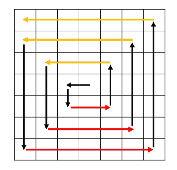 ν λ€μ΄λμ μ΄κΈ°ν κ³Όμ μ΄ λλ¬λ€λ©΄, λ¨μν Flood fill λ¬Έμ μλ λ¬λ¦¬ λμ νμΌλ‘ λμλκ°λ©° νμμ μ§ννμ¬μΌ νλ€. λ¬Έμ μμ κ·μΉμ `μ’, ν, μ°, μ`μΌλ‘ μμ§μ΄λ©° μμ§μ΄λ 거리λ `ν → μ°`, `μ → μ’` μΈ κ²½μ°μ κ±°λ¦¬κ° 1μ© μ¦κ°νκ² λλ€. μ¦, μ κ·Έλ¦Όμμμ λΉ¨κ°μ νμ΄νμΈ κ²½μ°μ, λ Έλμ νμ΄νμΈ κ²½μ°μ μ΄λνλ κ±°λ¦¬κ° 1μ© μ¦κ°νλ€.