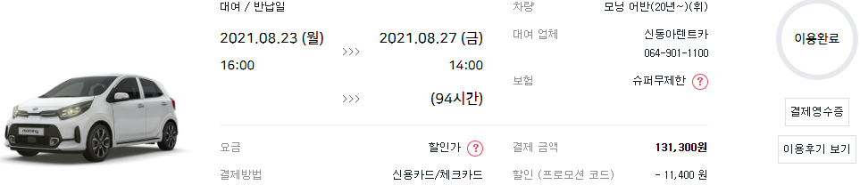 다양한 방식을 통해 예약할 수 있겠지만, `제주패스`라는 웹 사이트(어플)을 사용하여 `모닝 어반`을 예약하였다. 여러 업체들 중에서도 가격이 저렴하면서 블랙박스를 전차량에 설치한 `신동아렌트카`라는 업체의 모닝을 예약하였다.